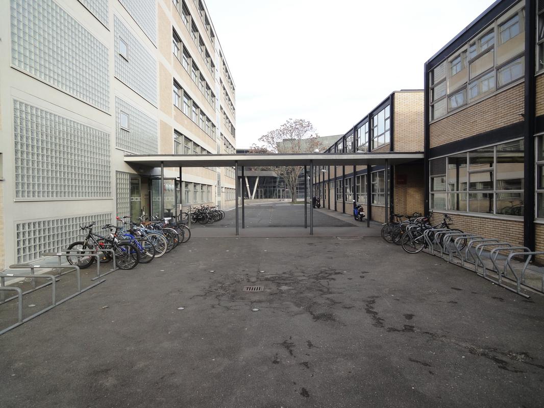 Die Gebäudegruppe der Elektrotechnik entstand 1958-59 nach Entwürfen von Karl-Heinz Schelling, Gerhard Bartels und Rolf Dreesen vom Hochschulbauamt Darmstadt. Die Breitseiten des Institutsbaus sind mit durchgehenden Fensterbändern, Sonnenschutzblenden und Brüstungsbändern aus gelben Klinkern horizontal gegliedert. Seine Stirnseiten hingegen weisen lediglich Öffnungen an den Enden der Flure auf und sind dementsprechend überwiegend mit gebäudehohen vertikalen Mauerscheiben, ebenfalls aus gelben Klinkern, geschlossen. Diesem mächtigen und regelmäßigen, mit der rationalen Logik eines Bürogebäudes geformten Quader ist der Hörsaalbau vorgelagert. Es bildet gleichsam den Hintergrund und die Kulisse für das skulpturale Hexagon. Die Nahtstelle zwischen den Bauteilen bildet ein zweigeschossiger, transparenter Verbindungsgang, getragen von dünnen Stahlstützen, der im Institutsbau in die asymmetrisch gelegene Querachse mit Treppenhaus führt und weiter nach Osten erdgeschossig eine direkte Verknüpfung zu den Versuchshallen herstellt. Die Gebäudekomposition von Instituts- und Hörsaalbau folgt den Prinzipien der additiven Bauweise mit in Bezug stehenden stereometrischen Körpern, die in großzügige Grünflächen eingebettet, den Geist der Moderne mit Licht, Luft und Sonne widerspiegeln.