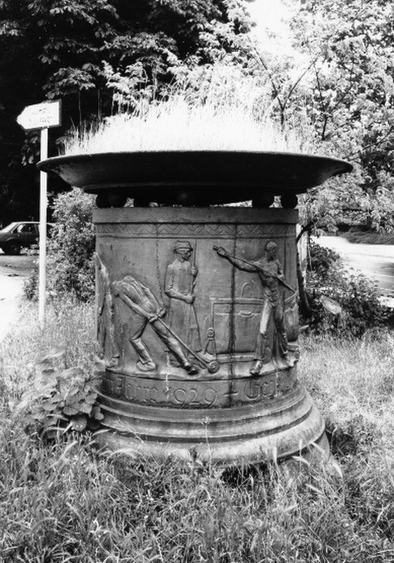 Runde, auf acht Kugeln gelagerte Bronzeschale; der Sockel zeigt Szenen aus der Arbeit des Eisengießens und war ursprünglich als Fuß eines gusseisernen Kandelabers für die städtische Festhalle auf der anderen Seite der Rheinstraße gegossen worden. Entwurf und Modell von Robert Dauer, Guß Herdfabrik und Eisengießerei Gebrüder Roeder 1929.