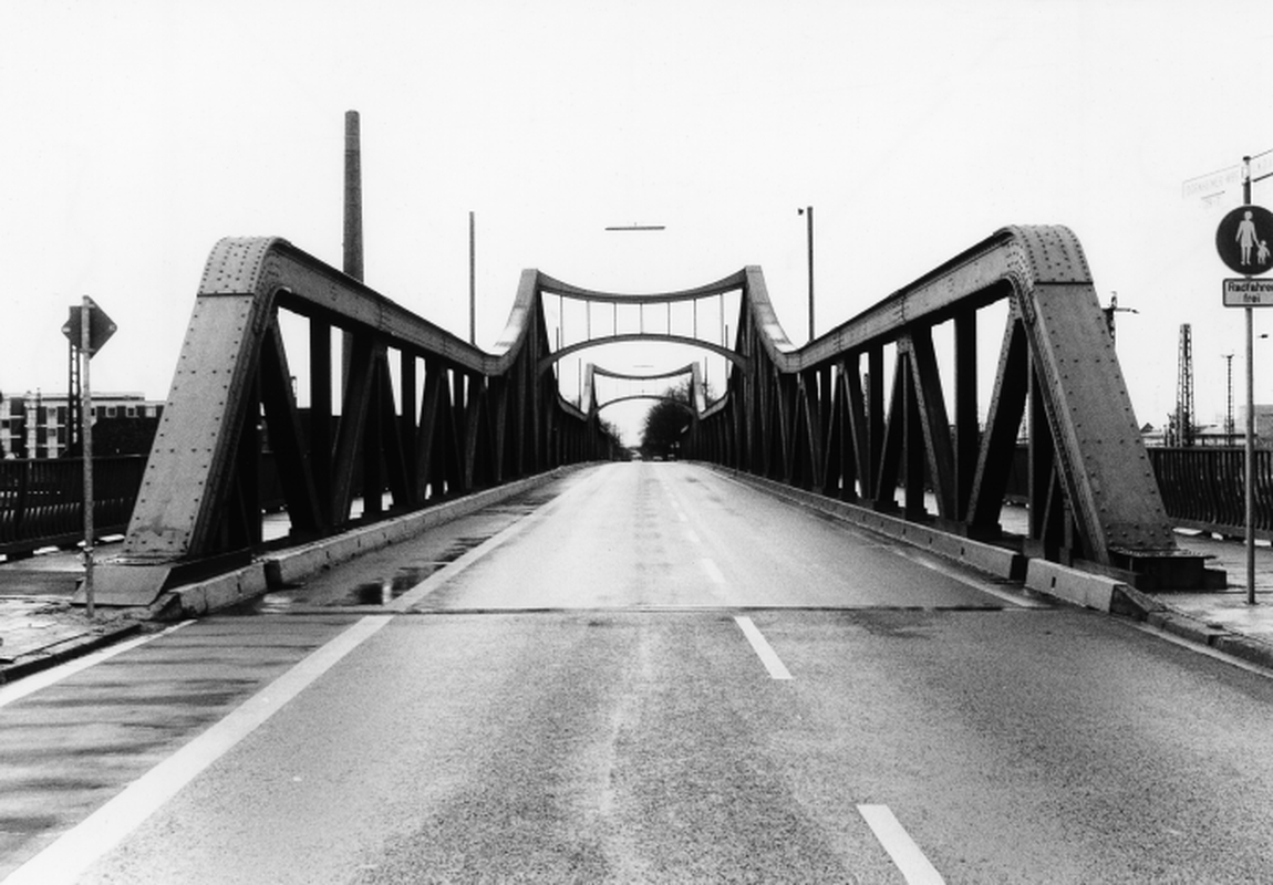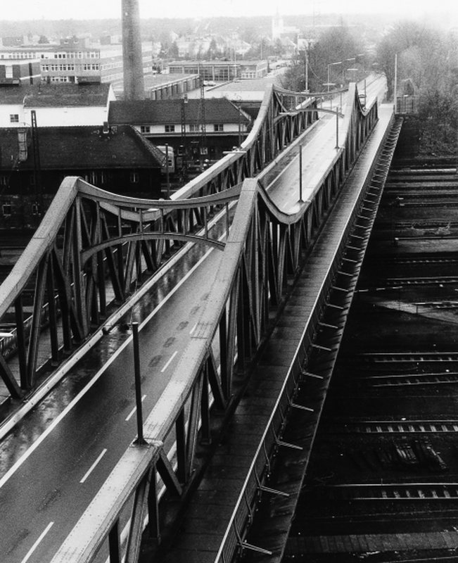 Die genietete Stahlbrücke, die Bismarckstraße und Dornheimer Weg verbindet, wurde 1910 gebaut. Hersteller war die Darmstädter Stahlbaufirma Donges. Die genietete Fachwerkkonstruktion wird durch zwei Portalbögen statisch ausgesteift. Bei der Elektrifizierung der Bahnstrecken in den fünfziger Jahren wurde die Brücke um rund einen halben Meter angehoben, das läßt sich an der einstigen steinernen Sitzbank unmittelbar neben dem Wasserturm erkennen: Die Sitzfläche bildet heute eine Ebene mit der Straße.