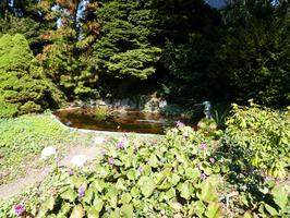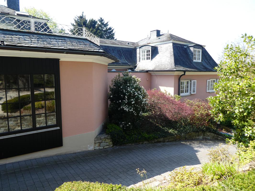 Im Nordwesten etwas unterhalb der Villa die kleine Garage, die sich klar an der Gestaltung der Villa orientiert. Schmuckvoll das voluminöse schiefergedeckte, geschwungene Walmdach mit zwei kupfernen Firstspitzen. Markante Ochsenaugen mit Betongewänden und Ziergittern an beiden Längswänden. Das Garagentor erneuert.