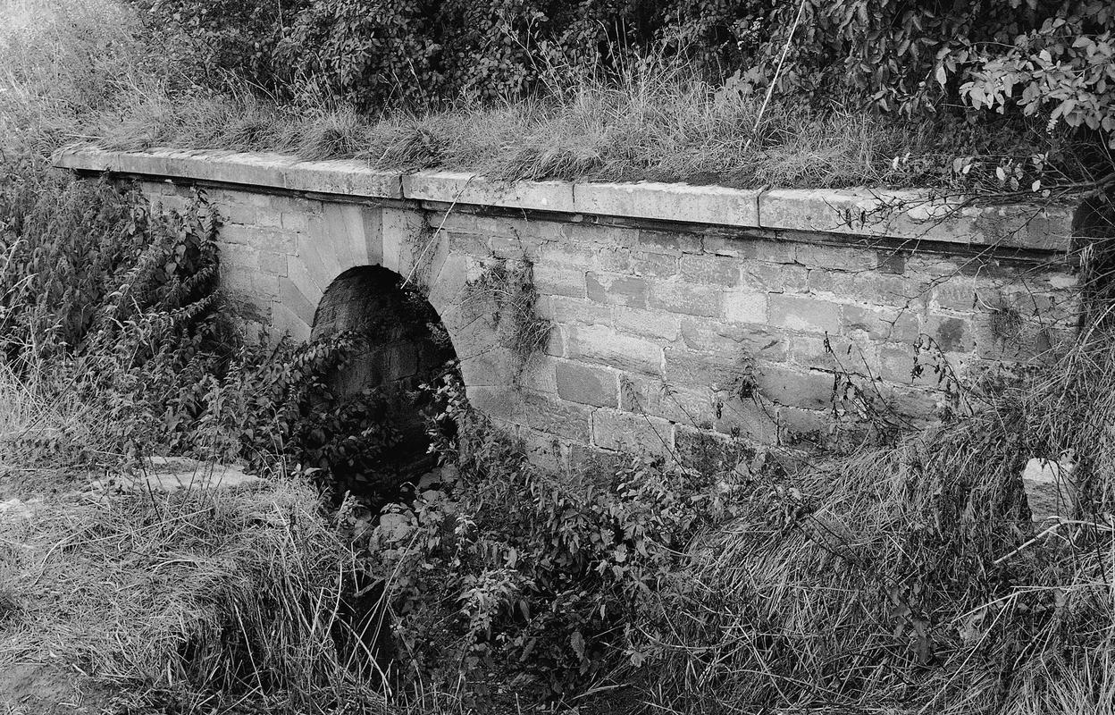 Tonnengewölbter Dammdurchlass von 1850 aus Sandstein mit beiseitig anschließender Dammmauer für einen ostwärts gerichteten Wassergraben.