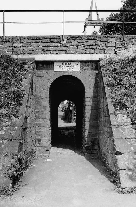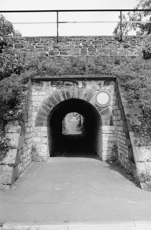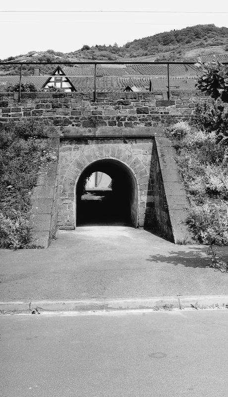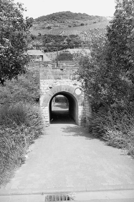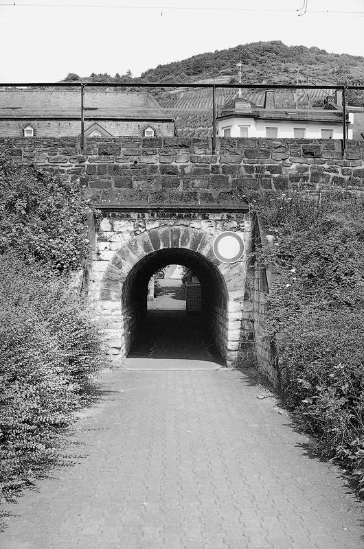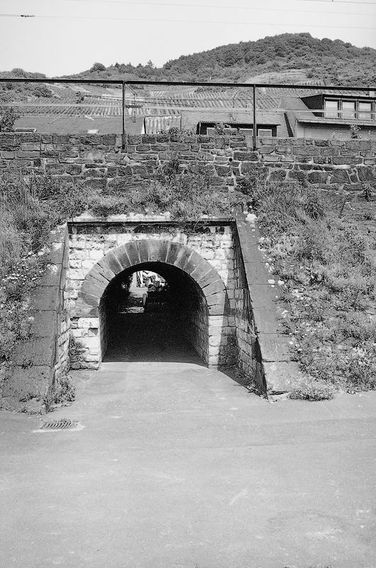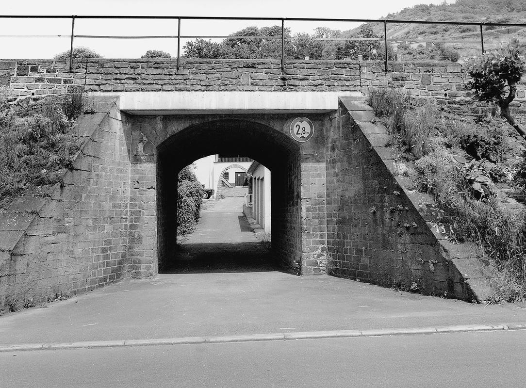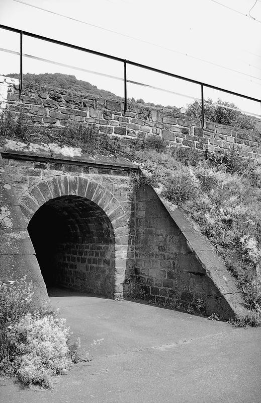 Tonnengewölbte Dammdurchlässe von 1857 aus Sandstein - meist mit rechteckigem Zierrahmen und Böschungsflügeln - als Querverbindung zwischen gleisparalleler Rheinstraße (Ostseite: in der Altstadt) und Rheinuferstraße (Westseite: B 42); auf den 500 Streckenmetern zwischen Bahnhof und Wispertalstraße insgesamt zwölf Durchlässe vorhanden.