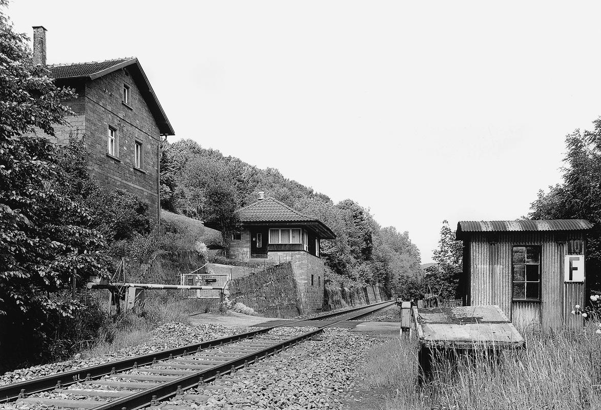 Giebelständiges Wohnhaus von 1882 aus Sandstein westlich der Strecke. Neben der Schranke zudem schmales Dienstgebäude um 1930 mit Erdgeschoss aus Sandstein und beplanktem Obergeschoss unter einem Walmdach.
