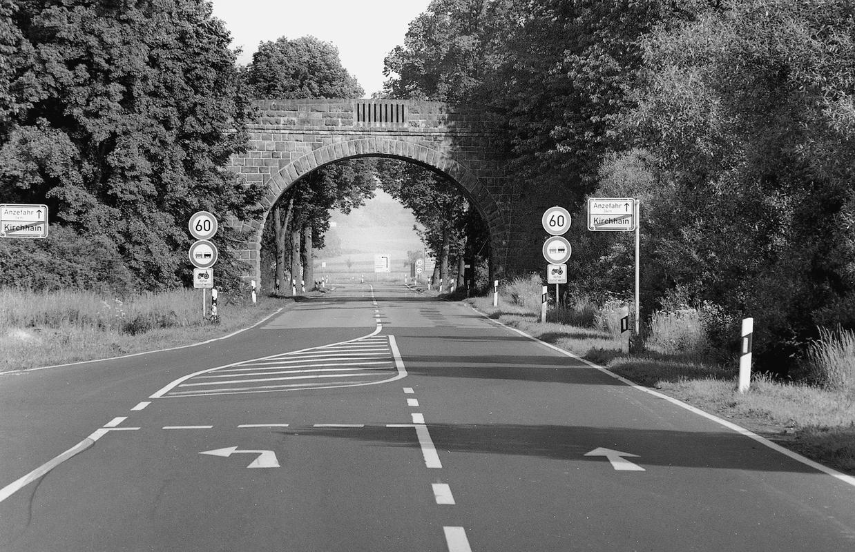 Bogenbrücke von 1912 aus Naturstein über die L 3073 am Ansatz der Einfädelkurve zur "Main-Weser-Bahn".