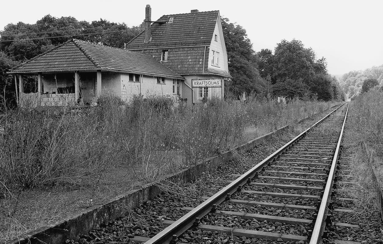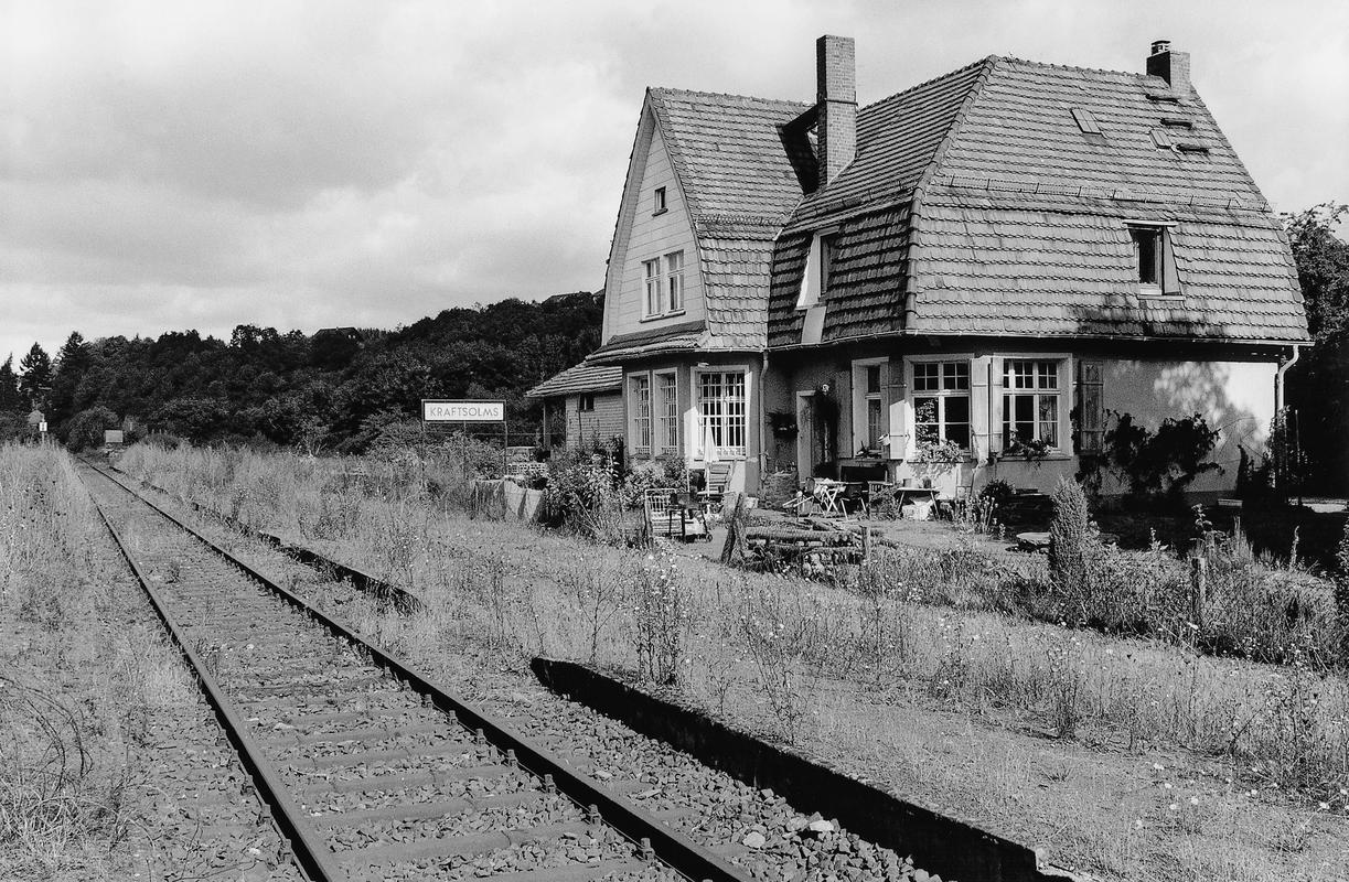Typenbau von 1912 als kleinere Variante mit Mansarddächern, Mittelgiebeln und geschrägten Ecken (wie Bf Neukirchen u. Bf Bonbaden) jenseits des Dorfs östlich der Strecke; nach Norden verschindelter Güterschuppen mit Pfeilervorhalle; im Stationsbereich eiserne Schwellen in Zweitverwendung (1899, 1903) oder als Ersatz (1921, 1936) von Gute Hoffnungshütte und Union.