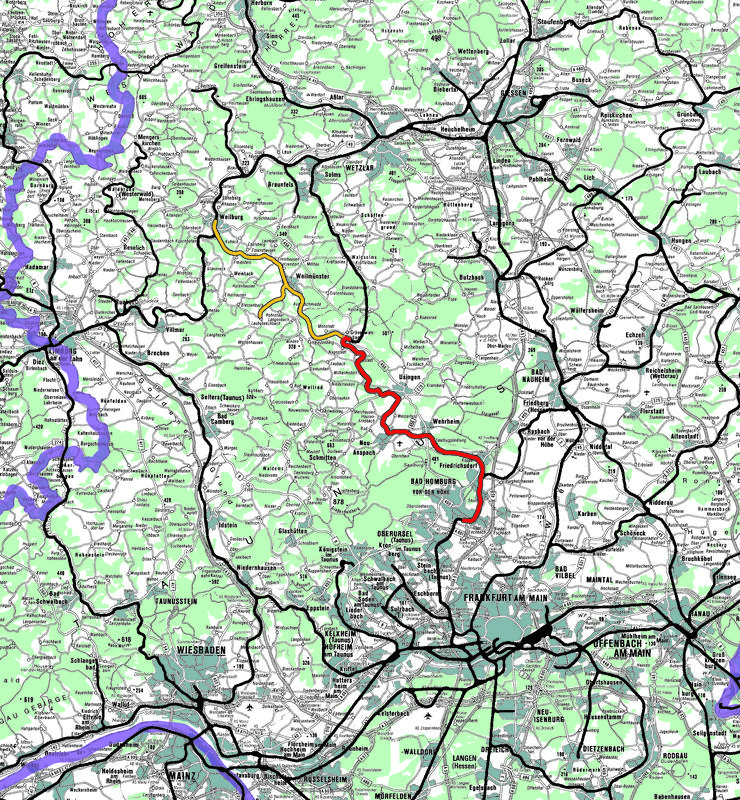 Die dritte Verbindung (s. Nrn. 010 u. 032) zwischen den Bahnlinien durch Lahn- und Maintal (s. Nrn. 017 u. 001) erfolgte zunächst von Norden her auf der Grundlage eines preußischen Gesetzes (1888). Dabei war an den durch Erzabbau im mittleren Lahngebiet zukünftig verstärkten Güterverkehr gedacht. Wenn auch unmittelbar nach Eröffnung der "Homburger Bahn" (1860; s. Nr. 015) erste Überlegungen für eine Teilstrecke von Süden nach Usingen für Holztransporte aus dem Hintertaunus bis 1863/65 zurückreichen, kam diese erste eine Generation später zustande. Das zwischen beiden Abschnitten fehlende Teilstück bat noch länger auf sich warten lassen und wurde erst auf Initiative von 32 Gemeinden des Weiltals nach der Jahrhundertwende realisiert. Fehlender Holztransport, endender Erzabbau und der völlige Rückgang des Personenverkehrs ab 1955 minderten die Bedeutung dieser Taunusquerbahn, führten zu abschnittweiser Stilllegung, schließlich zwischen Weilmünster und Grävenwiesbach zum Abbau, der landschaftlich reizvollen, allerdings erst ab Grävenwiesbach erhaltenswerten Strecke - Jenseits der untertunnelten Lahnberge folgte das Gleis südwärts den engen Tälern von Weil und Wiesbach, weicht hinter dem kleinen Knotenpunkt Grävenwiesbach (s. Nr. 107) dem Hartküppel (367 m) aus, um in vielen Kurven ostwärts entlang dem Steinkrotzenbach bei Wilhelmsdorf eine absolute Höhe von 400 Metern zu erreichen (maximale Steigung 1:40). Hier überwindet die Strecke die Wasserscheide zwischen Weil und Usa, fällt danach ins Usinger Becken ab, nutzt zwischen Graueberg (456 m) und Gickelsburg (471 m) das Köpperner Tal als Einschnitt zum Überwinden des Taunuskamms, um nach Friedrichsdorf und schließlich in letztem Bogen nach Bad Homburg zu gelangen.