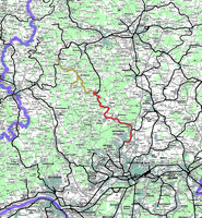 Die dritte Verbindung (s. Nrn. 010 u. 032) zwischen den Bahnlinien durch Lahn- und Maintal (s. Nrn. 017 u. 001) erfolgte zunächst von Norden her auf der Grundlage eines preußischen Gesetzes (1888). Dabei war an den durch Erzabbau im mittleren Lahngebiet zukünftig verstärkten Güterverkehr gedacht. Wenn auch unmittelbar nach Eröffnung der "Homburger Bahn" (1860; s. Nr. 015) erste Überlegungen für eine Teilstrecke von Süden nach Usingen für Holztransporte aus dem Hintertaunus bis 1863/65 zurückreichen, kam diese erste eine Generation später zustande. Das zwischen beiden Abschnitten fehlende Teilstück bat noch länger auf sich warten lassen und wurde erst auf Initiative von 32 Gemeinden des Weiltals nach der Jahrhundertwende realisiert. Fehlender Holztransport, endender Erzabbau und der völlige Rückgang des Personenverkehrs ab 1955 minderten die Bedeutung dieser Taunusquerbahn, führten zu abschnittweiser Stilllegung, schließlich zwischen Weilmünster und Grävenwiesbach zum Abbau, der landschaftlich reizvollen, allerdings erst ab Grävenwiesbach erhaltenswerten Strecke - Jenseits der untertunnelten Lahnberge folgte das Gleis südwärts den engen Tälern von Weil und Wiesbach, weicht hinter dem kleinen Knotenpunkt Grävenwiesbach (s. Nr. 107) dem Hartküppel (367 m) aus, um in vielen Kurven ostwärts entlang dem Steinkrotzenbach bei Wilhelmsdorf eine absolute Höhe von 400 Metern zu erreichen (maximale Steigung 1:40). Hier überwindet die Strecke die Wasserscheide zwischen Weil und Usa, fällt danach ins Usinger Becken ab, nutzt zwischen Graueberg (456 m) und Gickelsburg (471 m) das Köpperner Tal als Einschnitt zum Überwinden des Taunuskamms, um nach Friedrichsdorf und schließlich in letztem Bogen nach Bad Homburg zu gelangen.