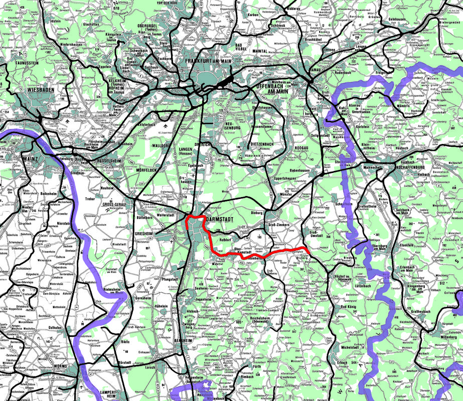 Bahnstrecke: Gleichzeitig wie der zentrale Abschnitt der "Odenwaldbahn" zu dessen direkter Verbindung mit ehemaliger Residenzstadt und im Nord-Süd-Verkehr beherrschender "Main-Neckar-Bahn" seit Erteilung der großherzoglichen Konzession 1868 als privat finanzierte Querbahn projektiert und doppelgleisig geplant, aber nur eingleisig ausgeführt. - Die innerbalb des Stadtzentrums 1910 vollig erneuerte Strecke umfährt das bebaute Damstadt weiträumig in halbrundem Nordbogen, um dann jenseits des Waldes im Südosten ihre endgültige Richtung durch flaches Hügelland entlang Darmbach und Modau sowie jenseits von untertuneltem Engelberg und Gersprenztal gegen die Ausläufer des Gebirges zu finden und die "Odenwaldbahn (I)" zu treffen. Ihr entspricht sie im ursprünglichen Ausbaustandard ebenso wie im Buntsandstein als landestypischem Baumaterial.