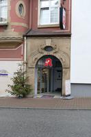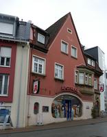 Das traufständige, zweigeschossige Gebäude unter hohem Mansarddach zeigt eine aufwendig gestaltete Fassade mit zeitgemäßen Stilelementen zwischen Traditionalismus und Jugendstil. Verputzter Massivbau mit Werksteinelementen. Dominant an der Straßenfront der große Dreiecksgiebel, der ohne Dekoration blieb. Im Erdgeschoss das segmentbogenförmige Schaufenster des Ladeneinbaues. Rechtsseitig Portal in Werkstein mit abstrahierten barocken Elementen. Im Obergeschoss leicht vorspringender Erker mit asymmetrisch angeordneten Fenstern, die durch die Zimmeraufteilung auf annähernd trapezförmigem Grundriss begründet sind. Die Fenster werden durch Rundstützen getrennt. Als Besonderheit sind die filigran gearbeiteten Metallelemente der Jalousie und des Blumenkastens zu sehen. Die Blumengitter sind ebenfalls bei den beiden benachbarten Fenstern des Obergeschosses erhalten. Der Erker wird von profilierten Gesimsen gerahmt, rechtsseitig zudem ein ovales Fenster. Im hohen Mansarddach Schlepp- und Fledermausgauben. Als traditionelles Gestaltungselement wurden die Fenster ursprünglich von Holzklappläden begleitet.