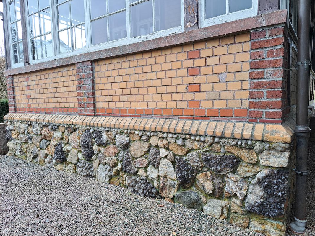 Fachwerkbau mit Ziegelausfachungen und massivem Sockel aus Zyklopenmauerwerk unter Verwendung heimischer Quarzkristalle. Türen, Fenster (inkl. historischer Einfachverglasung) und Bodenbeläge sind aus der Erbauungszeit überliefert, Veranda mit verzierten Hölzern und bauzeitlichen Bodenfliesen.