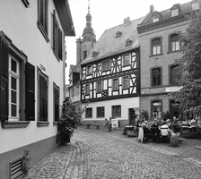 Bürgerhaus von 1683 (d) am Übergang vom Marktplatz in die Rosengasse. Das Erdgeschoss war nach 1900 als Metzgerladen genutzt, im Hof stand das zugehörige Schlachthaus der damaligen jüdischen Eigentümer.