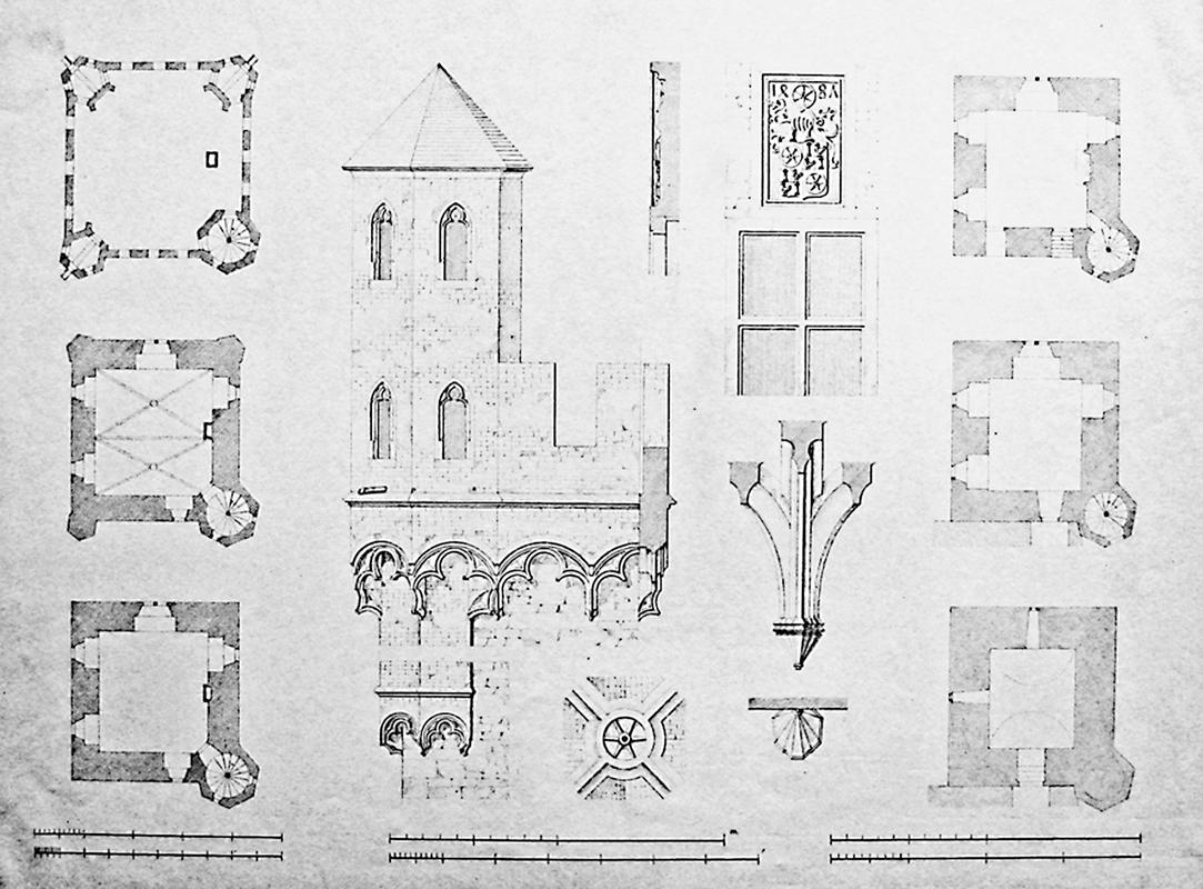 Das vierte Geschoss (Domherrenkammer) mit Kreuzrippengewölbe; ein Schlussstein mit Wappen des Heinrich von Virneburg.