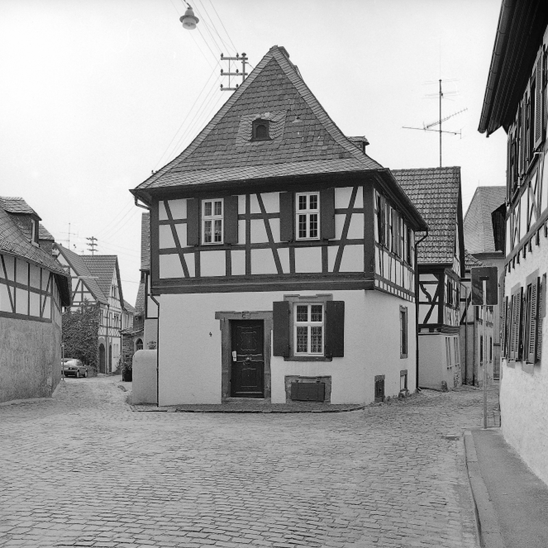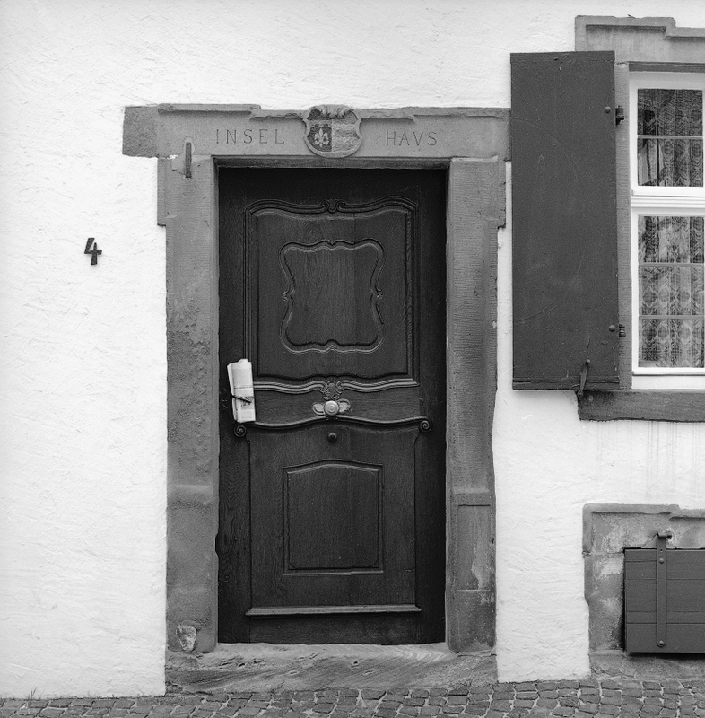 Am Schnittpunkt von Kirch- und Ellenbogengasse allseitig freistehendes Wohnhaus mit kleinem, ummauertem Vorhof. Über trapezförmig verzogenem Grundriss massives Erdgeschoss, teilweise vorkragendes Obergeschoss mit schlichtem Fachwerk des 18. Jhs. Hohes Walmdach mit kleinen Gauben. Im möglicherweise älteren Erdgeschoss Fenster- und Türöffnungen mit Ohrenumrahmungen aus Sandstein; gleichartige Fenstergewände des Obergeschosses aus Holz. Qualitätvoll geschnitzter Türflügel aus der Mitte des 18. Jhs., im Türsturz Bürgerwappen und Inschrift „INSELHAVS".