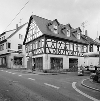 Giebelständiges Fachwerkhaus in Ecklage an der Einmündung Mühlstraße. Im Obergeschoss regelmäßiges, qualitätvolles Fachwerk um 1700 mit geradlinigen Mannfiguren, geschnitzten Knaggen, Feuerböcken als Brüstungszier und hochgestellten Andreaskreuzen an den Traufseiten. Giebelfachwerk neu vorgeblendet; moderne Gauben. Im Erdgeschoss ersetzten 1955 große Schaufenster und eine moderne Verkleidung die frühere Ladenfront mit Stichbogenfenstern. Rückwärtiger Erweiterungsbau ebenfalls aus Fachwerk, verputzt. Aufgrund seines reizvollen Fachwerkgefüges ist das Haus ein wichtiger Blickpunkt in diesem durch etwas inhomogenen Bebauung gekennzeichneten Straßenabschnitt.