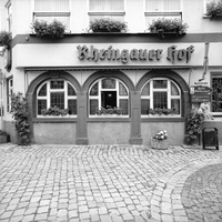 Auf älterem Erdgeschoss weitgehend im 18. Jh. errichtetes oder erneuertes Eckhaus. Als Gasthaus Rheingauer Hof seit 1849 erwähnt; kürzlich durchgreifend erneuert. Durch die prominente Lage an der platzartig erweiterten Einmündung der Marktstraße wesentlich das Bild der Stadtmitte bestimmender, verputzter Massivbau. Im Erdgeschoss zur Marktstraße hin eine zu Fenstern umgestaltete rundbogige Dreierarkade mit profilierten Sandsteingewänden, ähnlich denen des gegenübergelegenen Hauses Rheingauer Straße 19, wohl wie dieses um 1730 als Ladenarkaden entstanden. Im Keilstein abgeschliffenes Wappenschild mit Initialen A. H.