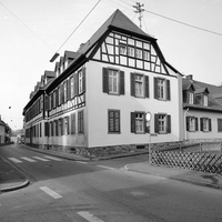 Stattliches langgestrecktes Wohnhaus. Ein Versatz gliedert den traufständigen Baukörper in zwei unterschiedliche Abschnitte von neun und sechs Achsen. Freistehender Ostgiebel zur Bahnhofstraße mit Krüppelwalm. Über massivem Erdgeschoss mit Sandsteingewänden Obergeschoss aus konstruktivem, ursprünglich verputztem Fachwerk. Die Freilegung von Sockel und Fachwerk entspricht nicht dem Bild der Bauzeit und verändert Proportionen und optische Erscheinung. Über der Durchfahrt des längeren Traktes ein früher in die Wand eingelassenes, jetzt davor gehängtes Terrakotta-Relief mit Vesperbild aus der Erbauungszeit. Aufgrund der langen Fassadenabwicklung besitzt das Gebäude besondere straßenraumbildende Qualität.