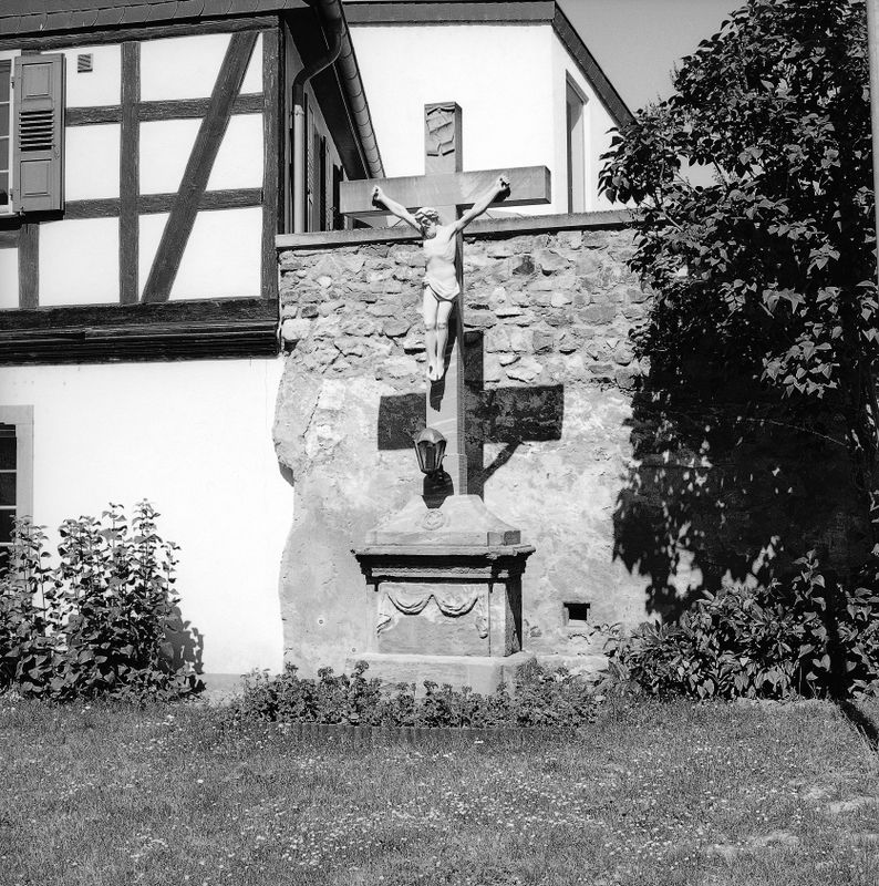 Auf dem Kirchhof nördlich der Kirche aufgestelltes, hohes Kruzifix aus Sandstein aus der 2. Hälfte des 18. Jhs. auf rechteckigem Sockel mit reliefiertem Draperiemotiv. An seinem ursprünglichen Standort am ehemaligen Kappelhof (Ecke Kiedricher/Erbacher Straße) diente das Kreuz als erste Station der Prozession am Himmelfahrtstag. Es wurde 1939 auf den Kirchhof versetzt.