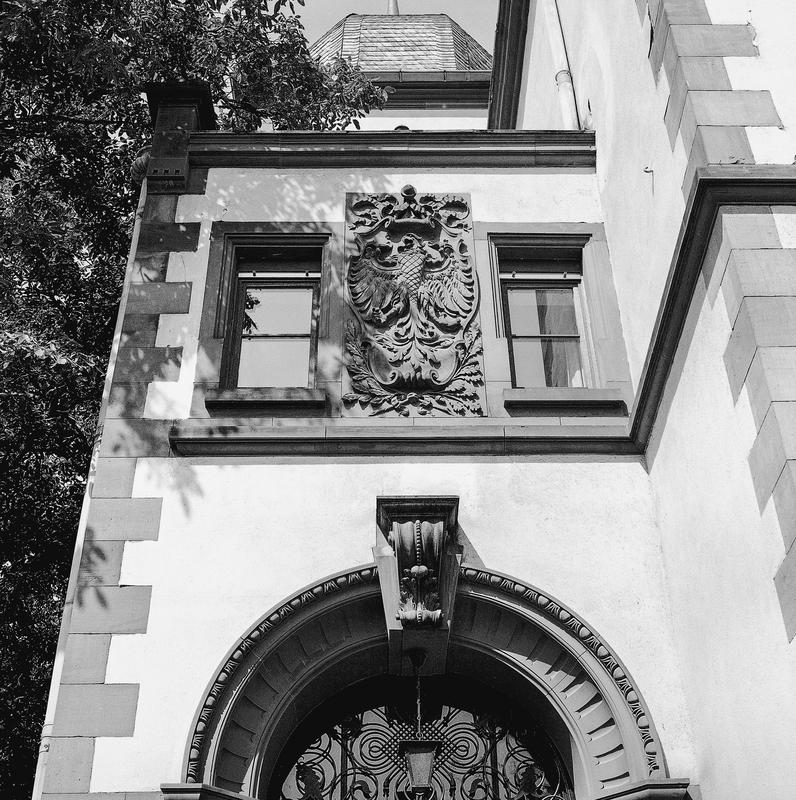 Voluminöser Baukörper in renaissancehaften Formen des „altdeutschen Stils". Putzfassade mit Sandsteingliederung über natursteinverkleidetem Sockel. Schieferdach mit spitzhelmbesetzten Gauben, über der vorspringenden Giebelfront als Krüppelwalm abschließend. Seitlicher Treppenhausanbau mit Haubendach. Über dem Rundbogenportal des Eingangs großes Wappenrelief mit preußischem Adler, in der Mitte zwischen den dreigeteilten Fenstern des Gerichtssaales im ersten Obergeschoss das Eltviller Stadtwappen. Repräsentativer Amtsbau der preußischen Zeit.