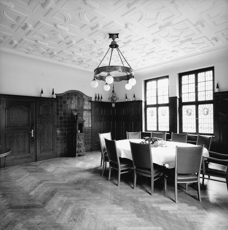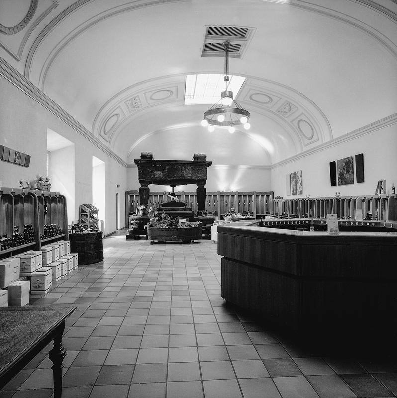 Im Inneren zeigt sich die ehemalige Kelterhalle, jetzt Verkaufsraum, in qualitätvoller, vom Jugendstil beeinflusster Ausstattung mit stuckverzierter Flachtonnendecke, farbigen Bleiverglasungen an Seitenfenstern und Oberlicht sowie (teilweise erhaltenen) Wandfliesen. Der großzügig bemessene Raum wurde durch eine nachträglich eingebrachte Zwischenwand etwas verkürzt. Seitlich des Eingangs repräsentative Probierstube mit Holzeinbauten und Vertäfelung, geometrischer Stuckdecke und gefliester Ofenrückwand. Unter dem Gebäude aufwendiger Fasskeller in Form zweischiffiger, backsteingemauerter Kreuzgratgewölbe auf Mittelsäulen aus Sandstein. Eine der größten historischen Kellereien im Rheingau.