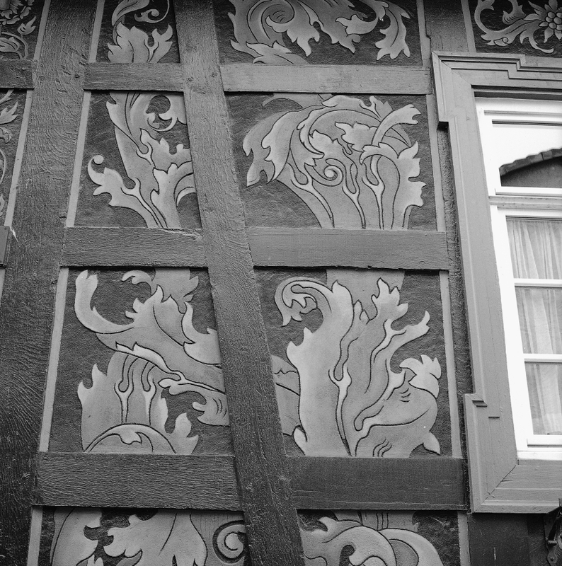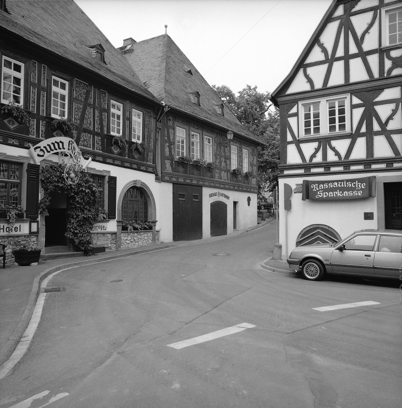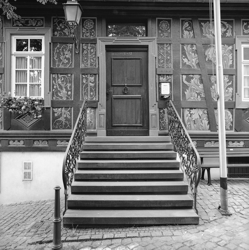 An einem kleinen, aus einer Straßengabelung entstandenen Platz in der Ortsmitte gelegenes Fachwerkhaus, erbaut 1719 (Datum im Eckständer). Der deutliche Geländesprung wird durch einen hohen Massivsockel mit Einfahrt zur Hauptstraße genutzt; hier bestand ehemals eine Halle mit Balkendecke, die von vier Stützen mit Sattelholz, geschweiften Streben und Unterzügen getragen wurde. Darüber ein Fachwerkgeschoss und das verschieferte Walmdach mit kleinen Gauben. Eingang mit Freitreppe von Osten (Eberbacher Straße). Die schlichte, konstruktive, dreifach verriegelte Hölzerstellung mit den durch ausgesparte Rauten betonten Brüstungsfeldern in Verbindung mit hochformatigen Fenstern und Tür mit Ohrenumrahmung sind typisch für die Bauzeit um 1720. In den 1920er Jahren erfolgte eine Neugestaltung der Putzgefache durch Sgraffiti in bewegter Blattornamentik aus der Hand des ortsansässigen Malers Claudy.