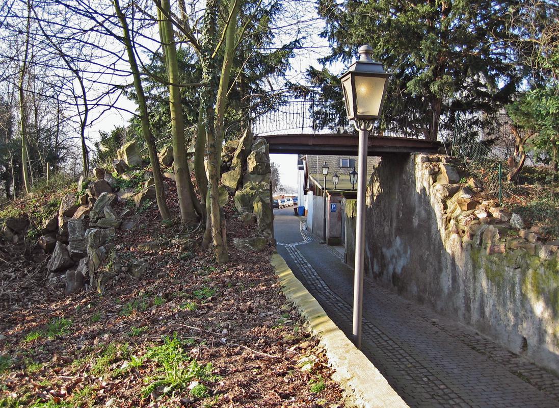 An der Rheinseite umfangreicher Hausgarten und jenseits der Rheinstraße zugehöriges weiteres, größeres Gartengrundstück. Beide Gärten ummauert und durch eine Brücke aus der 1. Hälfte des 19. Jhs. mit zierlichem schmiedeeisernem Geländer verbunden. Grundzüge des Landschaftsgartens aus dem 19. Jh. sind erhalten. Die Aufgänge zur Brücke als Grotten gestaltet, das Gelände insgesamt stark modelliert und zu den Mauern hin erhöht, von einzelnen alten Bäumen bestanden. Im südlichen Garten stand früher ein Schweizerhaus.