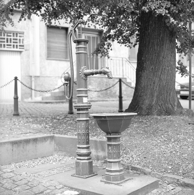 Auf dem Platz vor dem Rathaus nahe dem überbauten Hallgartener Bach aufgestellter gusseiserner Pumpenbrunnen mit achteckiger Schale. Brunnensäule und Schalenfuß tragen gleichartige Ornamentverzierungen, der Auslauf hat die Form eines Tierkopfes. Die standardisierte Brunnenform der Zeit um 1900 wurde jeweils nur im Detail abgewandelt. Dokument der dörflichen Wasserversorgung um die Wende zum 20. Jh.