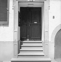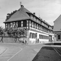 Stattliches, langgestrecktes Gebäude, aus ehemals zwei Häusern entstanden. Erdgeschoss massiv, Obergeschoss ursprünglich aus Sichtfachwerk, auf abgerundeter Schwelle leicht vorkragend; Mannfiguren mit Knaggen teilweise erhalten. Im 18. Jh. durch konstruktives, ehemals verputztes Fachwerk mit regelmäßiger Fensterstellung ersetzt. Eingangsbetonung durch profilierte Ohrenumrahmung mit Wappenkartusche und Oberlicht aus Sandstein. Gute verzierte Haustür des ausgehenden 18. Jhs. mit zwei Flügeln unterschiedlicher Breite. Im Zuge des Straßenausbaus wurde der repräsentative Treppenaufgang aus Sandstein zwischen in Voluten auslaufenden Wangen entfernt und die Treppe mit Tür zurückverlegt. Daneben ein rundbogiger Kellereingang. Das Dach schließt nach Westen als Walm, nach Osten als Krüppelwalm ab. Ehemalige Einzelgauben wurden in jüngerer Zeit zu breiten Schleppgauben zusammengefasst. Der langgestreckte Bau stellt ein wichtiges raumbildendes Element im Straßenzug dar.