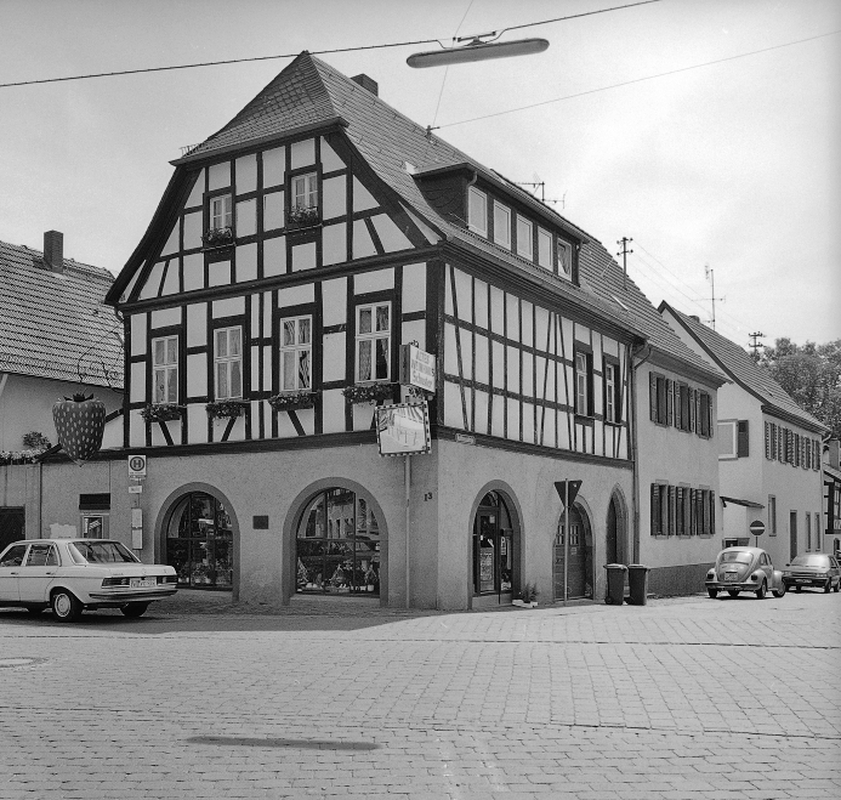 Stattlicher Bau an zentraler Stelle an der Ecke Rathausgasse. Mit seinem massiven, vielleicht im 15. Jh. entstandenen Erdgeschoss steht der Bau in der Reihe spätmittelalterlicher Rheingauer Rathäuser mit erdgeschossiger Halle (vergl. Oestrich, Mittelheim, Kiedrich). An der Westseite zur Rathausgasse eine Spitzbogentür mit schlicht gekehltem Gewände. Die Rundbögen an dieser Seite waren 1954 noch vorhanden, die giebelseitigen kamen um 1957 hinzu oder wurden wieder freigelegt. Im Inneren ist eine zentrale achteckige Holzstütze (um 1434 d) mit Streben, Sattelholz und Unterzug erhalten, die Halle jedoch durch nachträglich eingezogene Wände unterteilt. Nach Osten schließt sich ein massiver, halbrunder, gewölbter Anbau, wohl der ehemalige Kerker, an. Das Obergeschoss wurde nach Brand gegen Ende des 18. Jhs. in konstruktivem, für Verputz konzipiertem Fachwerk neu aufgesetzt. Die breite Giebelfront mit Krüppelwalm wirkt platzbeherrschend. Frühere Einzelgauben wurden durch eine moderne breite Gaube ersetzt.