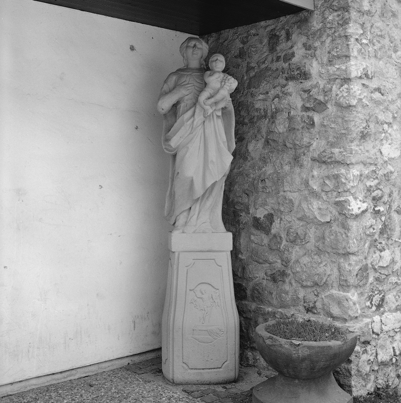 Früher am Draiserweg (nahe dem ev. Pfarrgarten) aufgestellte Madonnenstatue, Stiftung des Ehepaares Conrad Koch und Maria Brigitta Schnock von 1746. Sie wurde 1975 anlässlich der Einweihung des neuen Pfarrzentrums der katholischen Pfarrgemeinde schenkungsweise überlassen und nach Renovierung hier aufgestellt. Muttergottesfigur aus Sandstein auf quadratischem, leicht geschwungenem Sockel mit Reliefbild. Seitlich die Stifterinschrift und auf der (jetzt nicht einsehbaren) Rückseite Fürbitte.