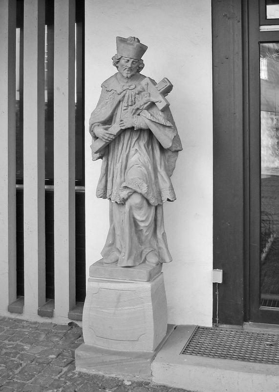 Der frühere Standort der Heiligenfigur lag nahe am Bahndamm, ursprünglich wohl am Kisselbach. Zeitweise als Bestandteil eines modernen Brunnens auf dem „Nepomukplatz" zwischen Eberbacher und Franseckystraße aufgestellt, wurde die Figur 1976 dort durch einen Betonabguss ersetzt und das Original in das Pfarrzentrum verbracht. Figur des späten 18. Jhs. aus rotem Sandstein. Der originale, quadratische Sandsteinsockel mit profiliertem Gesimsabschluss ist nicht erhalten.