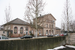 Das Bahnhofsgebäude wurde 1862 in den Formen des Neoklassizismus errichtet und zeigt eine differenzierte Abfolge von Baukuben. Zentrale Stellung nimmt das Empfangsgebäude mit dem Hauptzugang ein, der über drei Geschosse errichtet wurde und eine klare Gliederung durch symmetrisch angeordnete rundbogig abschließende Fenster- und Türöffnungen aufweist. Die Fassaden sind aus hellen, fast gelblichen Sandsteinquadern mit Kantenschlag und gestockter Spiegel-Oberfläche. Als gliederndes Element wird ein rötlicher Sandstein für den Sockel, die Gesimsbänder und die Überfangbögen der Fenster eingesetzt. Der Hauptbau wird von zwei weitgehend identisch ausgeführten eingeschossigen Bauteilen begleitet, die traufseitig ausgerichtet sind. Die Fassaden des westlichen Pavillons sind verputzt, nur die Gebäudekanten, der Sockel und ein Streifen unter dem Dachrand sind aus Sandstein. Westlich schließt sich ein ebenfalls eingeschossiger Eckpavillon unter einem Walmdach an. Das Bahnhofsgebäude ist einschließlich der Stellwerke und der Signale aus geschichtlichen Gründen Kulturdenkmal.