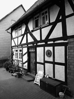 Der zweizonige Wohnteil eines großen Hofs blieb im Obergeschoss relativ gut erhalten. Das Gefüge ist sparsam, jedoch beeindruckend durch seine Regelmäßigkeit. Die Aussteifung erfolgt durch breite, einfach verriegelte Mann-Figuren mit verzierten Kopfstreben statt der üblichen Winkelhölzer. Die Rückseite zeigt weniger repräsentative K-förmige Verstrebungen. Das Haus ist in das 18. Jahrhundert zu datieren, das Erdgeschoss wurde gegen 1900 in regional üblicher Weise konstruktiv erneuert, wobei die Haustür - vielleicht aus der Bauzeit des Hauses stammend und der Haustür der Teufelsmühle in Ilbeshausen sehr verwandt - erhalten blieb. Sie ist mit feinen Reliefs versehen, die teils noch dem Rokoko und teils bereits dem Klassizismus zuzuordnen sind und hat ein Oberlicht aus der zweiten Bauphase. Das Haus ist Kulturdenkmal aus geschichtlichen Gründen, wobei der Haustür ein besonderer Seltenheitswert zukommt.