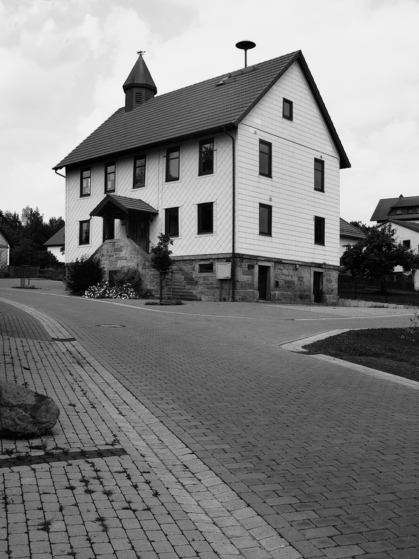 Der 1835 entstandene Typenbau markiert die Ortsmitte und stellt - freilich in zurückhaltender Weise - eine Dominante im Dorfbild dar. Zwei mit Platten verkleidete Geschosse, gegliedert durch fünf zu zwei Fensterachsen, erheben sich über sorgfältig gefügtem Sandsteinsockel. Die Fassade wird bestimmt durch eine große zweiläufige Freitreppe aus Sandstein. Auf dem First hebt sich, nach Norden verschoben, ein einfacher kleiner achtseitiger Dachreiter mit Spitzhelm. Er ist verschiefert. Das bedeutendste öffentliche Gebäude des Dorfs, ehemals Schule und noch für Gemeinschaftszwecke und Gottesdienste genutzt und 2009/10 erweitert, ist aus ortsgeschichtlichen und städtebaulichen Gründen Kulturdenkmal.