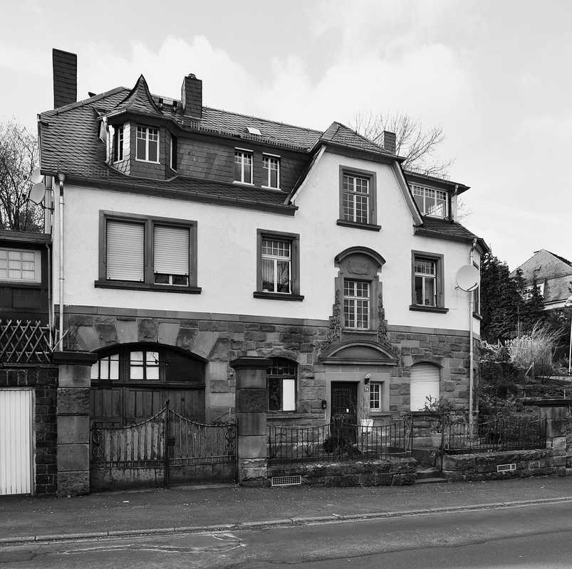 Das Haus ist ein breiter, zweigeschossiger Massivbau aus dem Jahr 1907. Es steht von der Straße zurück, den Hof davor schließt ein schmiedeeiserner, mit floralen Elementen verzierter Zaun, der links eine Zufahrt zwischen schweren Sandsteinpfeilern offen lässt. Das Erdgeschoss des Hauses ist aus Sandsteinbossenquadern und hat links eine segmentbogige Einfahrt und rechts den Hauseingang zwischen großen Segmentbogenfenstern. Das Obergeschoss ist verputzt, das schiefergedeckte Krüppelwalmdach ausgebaut mit Schleppgaube, Dachtürmchen und einem Zwerchgiebel oberhalb der Achse des Eingangs. Diese ist gestalterisch betont: Den Eingang mit seiner Jugendstiltür verdacht ein Segmentgiebel, zu dessen Seiten Reliefs von Weinstöcken bis zum ebenfalls übergiebelten Treppenhausfenster darüber reichen. Spannend sind hier die Übergangsformen vom Historismus zum Jugendstil. Erhalten und wesentlich für das ansprechende und werbende Erscheinungsbild des Hauses sind Fenster und Türen der Bauzeit.