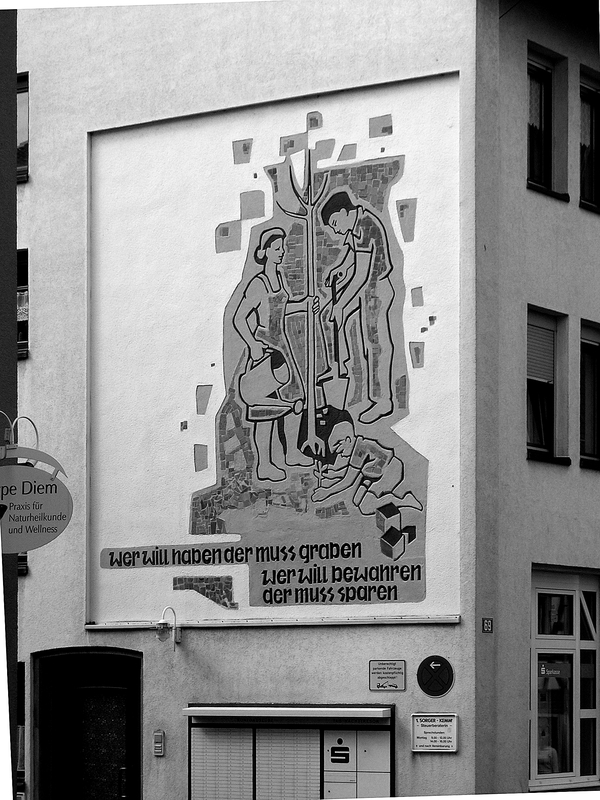 Am veränderten Gebäude der Sparkasse blieb außen ein werbendes Wandbild aus den 1960er Jahren erhalten, dessen Motto gleichsam eine "abgeschlossene Kulturperiode" vorstellt: Ein Elternpaar pflanzt einen Baum, während der kleine Sohn im Vordergrund diese Tätigkeit spielerisch nachahmt. Unterhalb des Bilds, dessen Umrisse in den Putz eingetieft und dessen Flächen partiell als Mosaik ausgebildet sind, lautet eine Inschrift: "wer will haben der muss graben / wer will bewahren / der muss sparen." Die zeittypische, dem Kunst-am-Bau-Gedanken verpflichtete Wandgestaltung ist Kulturdenkmal aus geschichtlichen Gründen.