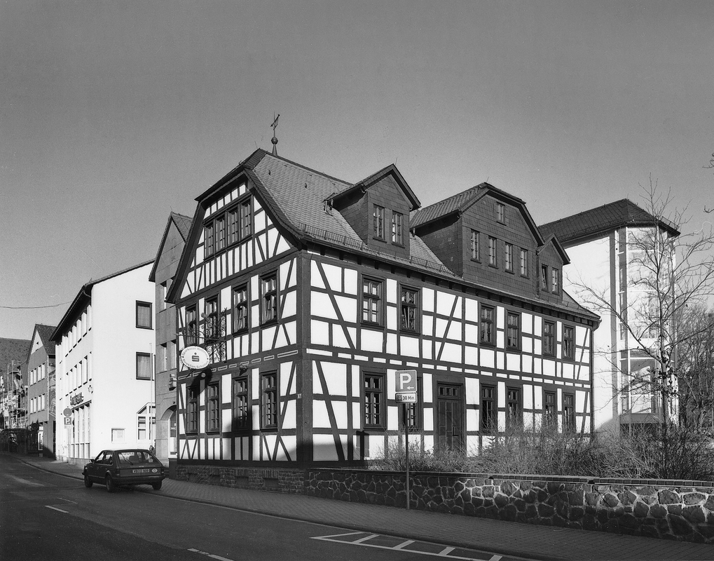 Im Kern klassizistischer Fachwerkbau zu zwei Geschossen, die doppelt verriegelt sind und durch lange Streben ausgesteift werden. Gestalterisch bemerkenswert sind unter den Fenstern eingesetzte Stiele, die zusammen mit kurzen seitlich platzierten Fußstreben das Fassadenbild wirkungsvoll bereichern. Das anspruchsvoll-repräsentative, über die reine Konstruktion hinausgehende Motiv erscheint in Schotten bei um 1800 errichteten Gebäuden mehrmals. Die der Straße zugewandte Giebelseite des ehemaligen "Hessischen Hauses" schließt mit einem Krüppelwalm. Dieser wurde – dem Haus-typ entsprechend – hergestellt, als man von dem Gebäude, das noch bis zum Ausgang des 20. Jahrhunderts bedeutendes Gasthaus und Hotel war, den Außenputz entfernt hat. Der Bau markiert zusammen mit dem gegenüberstehenden Haus Schlossgasse 2/2A den Standort der früheren Unterpforte und hat heute noch eine Torfunktion zwischen Alt- und Vorstadt. Als Wohn- und Amtsgebäude des Landrats vor dem Bau des Kreisamts kommt dem Haus darüber hinaus eine geschichtliche Bedeutung zu.