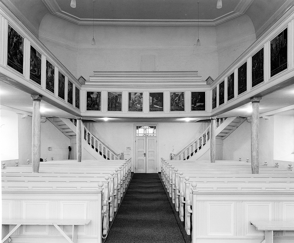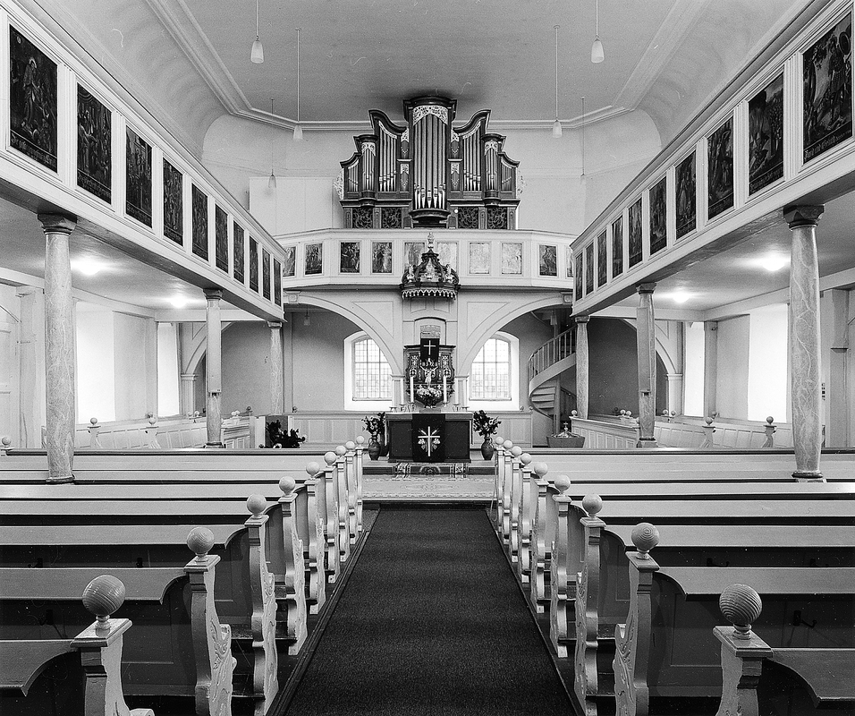 Das Innere der Kirche ist von "eindrucksvoller und großzügiger Raumwirkung" (Dieter Großmann); es hat eine durch Stuckleisten gegliederte Voutendecke und an drei Seiten Emporen über schlanken, in weitem Abstand voneinander stehenden Säulen. Im Osten erhebt sich die Orgelempore über zwei ausladenden Bogen, zwischen denen an breitem Mittelpfeiler Kanzel und Schalldeckel angebracht sind, beide in spätbarocker Ornamentik, der Schalldeckel mit Volutenkrone und Vasen. Die Orgel wurde 1776-80 von Philipp Ernst Wegmann beziehungsweise Johann Friedrich Meynecke geschaffen und hat einen prächtigen, bewegt umrissenen Prospekt mit feinen durchbrochenen Rokokoverzierungen. Die Anordnung der für den Gottesdienst wesentlichen Ausstattungsteile charakterisierte Heinrich Walbe als "ein sehr schönes Beispiel der protestantischen Vereinigung von Altar, Kanzel und Orgel". Die Gestühlswangen wurden mit Flachschnitzereien (Akanthus, Kartusche) versehen und mit Kugeln bekrönt. Bemerkenswert sind die aus der Bauzeit des Schiffs stammenden Brüstungsbilder an den Emporen, ausgeführt von "Hisgen von Lich". Sie zeigen vor der Orgel Apostel und Evangelisten, sonst Szenen des Alten und Neuen Testaments von der Erschaffung der Welt bis zur Ausgießung des Heiligen Geistes. "Ein reizendes Werk des Rokoko ist die Auffindung Mosis durch die Tochter des Pharao; andere Gemälde lassen bedeutende Vorbilder erkennen." (Dieter Großmann). Die Kirche ist Kulturdenkmal aus geschichtlichen, künstlerischen und städtebaulichen Gründen. Auf dem durch alten Baumbestand geprägten Kirchhof steht zur Straße hin das nach dem Zweiten Weltkrieg aus drei Stelen gebildete Gefallenendenkmal, das von geschichtlicher Bedeutung ist.