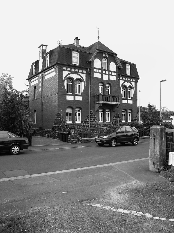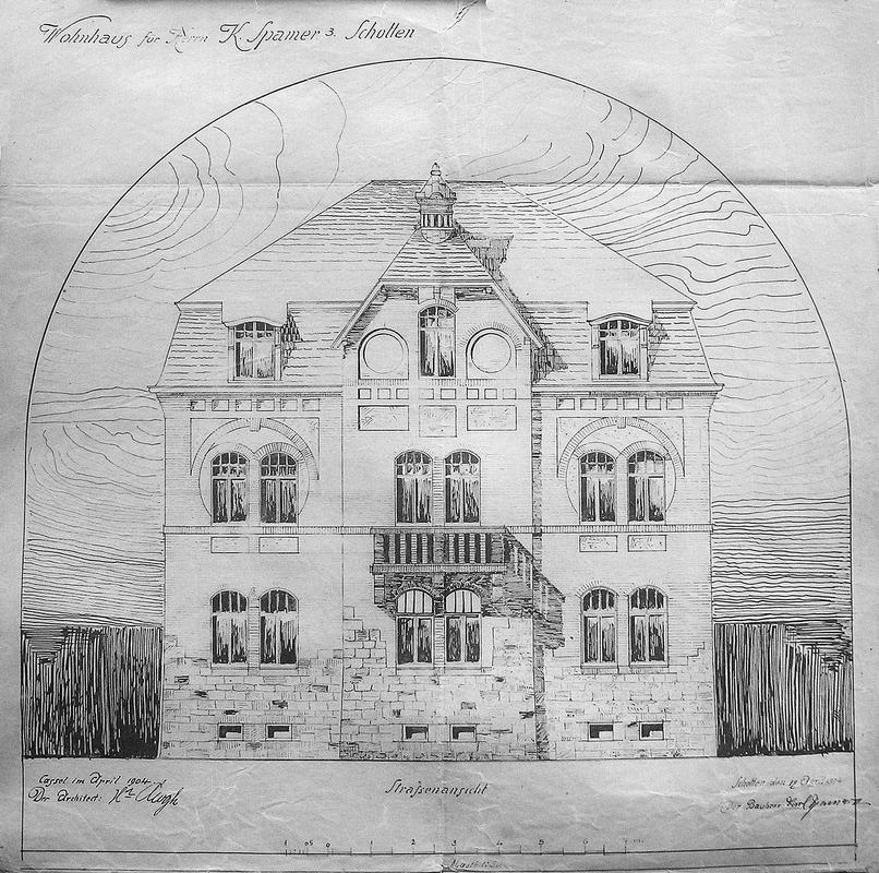 Anspruchsvoller villenartiger Wohnbau im Dekor des Jugendstils, 1904 über einem unregelmäßig abschließenden Basaltsockel zweigeschossig aus rotem Backstein errichtet und mit hohem Mansarddach versehen. Zur Straße ist ein dreigeschossiger Mittelrisalit mit Krüppelwalmdach und Firstnadel ausgebildet. Die Fassadengliederung erfolgt nach oben zunehmend durch weiß gefasste Putzfelder, von denen zum Beispiel gekuppelte Bogenfester des Obergeschosses kreisförmig umrahmt werden. Betont ist das gestuft vortretende Kranzgesims. Weitere bemerkenswerte Details sind die wie Säulen ausgebildeten Bauglieder zwischen den Fenstern, der Balkon vor dem Risalit, die an den Seitenfassaden lisenenartig vortretenden Kamine und die dem Sockel angepasst gestaltete Grundstückseinfriedung. Das Haus wurde durch den Kasseler Architekten Heinrich Mogk für den Maurermeister und Bauunternehmer Karl Spamer entworfen.
