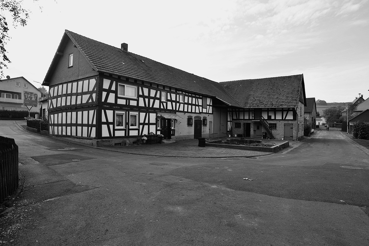 Winkelförmig ausgebauter Streckhof. Ältester Teil ist das Wohnhaus, das an der Giebelseite noch Mann-Verstrebung und abgerundetes Quergebälk sowie einen Eckständer mit gedrehter Säule zeigt, Es stammt aus dem 18. Jahrhundert, die Front ist aber im 19. Jahrhundert als konstruktive Fachwerkwand erneuert worden und erhielt gegen Ende des gleichen Jahrhunderts eine zweiflügelige Haustür mit historistischem Dekor. Der anschließende Stall- und Scheunentrakt leitet über in das 20. Jahrhundert, bleibt aber der alten Struktur angepasst.