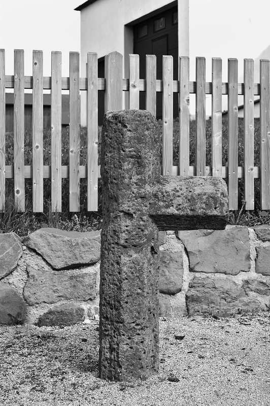 Schlichtes, nicht vollständig erhaltenes Steinkreuz unbekannter Entstehungszeit, wohl mit Bezug zur früheren Gerichtsfunktion des Dorfs, nach anderen, eher unwahrscheinlichen Angaben vom älteren Kirchenbau stammend. Kreuzstamm und -balken, von denen einer abgebrochen ist, sind durch kräftige Abfasungen achtseitig ausgebildet.