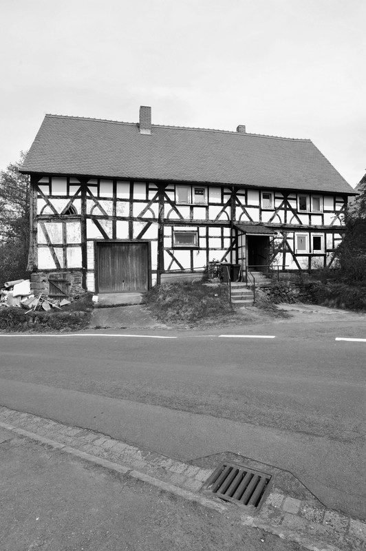Der große, fünfzonige Einhof erhebt sich auf ansteigendem Gelände am nördlichen Dorfausgang. Er ist um 1770 entstanden, seine Fassaden werden durch zweifach verriegelte Mann-Figuren mit achtelkreisförmigen Gegenstreben gegliedert und ausgesteift. An den Eckständern des Wohntrakts sind gedrehte Stäbe ausgebildet. Die Wirtschaftsbereiche – Stall, Tenne und ein weiterer Stall – sind im Erdgeschoss teilweise erneuert, insgesamt aber bleiben die alte Funktion und die repräsentative Wirkung des Fachwerks gut nachvollziehbar. Ein ursprünglicher Besitzer des Anwesens wandert in der Mitte des 19. Jahrhunderts nach Mailand aus und vermachte das Haus 1875 der Gemeinde Hopfmannsfeld, die es knapp 100 Jahre später veräußerte.