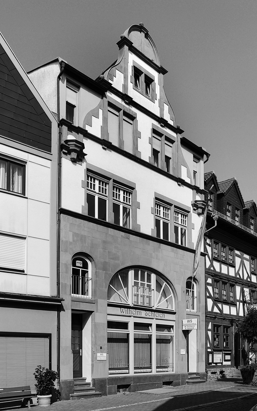 Auffallendes Wohn- und Geschäftshaus, erbaut im frühen 20. Jahrhundert in Formen eines historisierenden Jugendstils. Die untere Hälfte der Fassade ist aus glatten Sandsteinquadern errichtet. Sie hat in der Mitte ein breites und zwei Geschosse hohes, korbbogig abschließendes Schaufenster zwischen schmalen Eingängen. Oberhalb der Eingänge öffnen noch schmale Bogenfenster die Wand. Über einem Sohlbankgesims folgen eine weitere Etage und der steile, geschweifte Giebel. Hier sind Putzflächen mit Sandsteindetails kombiniert. Die Formen der Fenstergewände, der Lisenen und Gesimse und der unvermittelt vor den Giebelansätzen applizierten Konsolen verweisen wie der Giebelumriss auf die Renaissance.