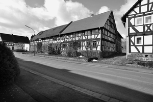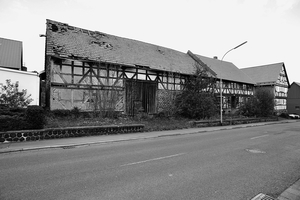 Großer traufständiger Streckhof von besonderer orts- und baugeschichtlicher sowie städtebaulicher Bedeutung. Das Wohnhaus ist in drei Zonen gegliedert, wobei die Breite des Ernbereichs auffällt. Das Fachwerk zeigt Geschossauskra-gungen und zumeist die späte Form der klassischen Mann-Figur. Das Quergebälk ist dabei sehr gediegen gearbeitet und, zwischen feinen Profilen, mit gerundeten Füllhölzern und Balkenköpfen versehen. Die Eckständer haben gedrehte Stäbe, und im Giebel sitzen kleine, geschweift abschließende Fenster mit Resten alter Verglasung. Der nach einer Brandmauer links an das Wohnhaus anschließende jüngere Wirtschaftstrakt aus 1928 ist fünf Zonen breit. Er hat eine aus Basalt errichtete Stallfront, während das Fachwerk dem des Wohnhauses angepasst ist. Rückwärts schließt sich dem Wohnhaus ein weiterer Trakt an, der im Erdgeschoss als Stall und Brennerei aus Basalt mit Sandsteinecken errichtet ist und im Obergeschoss, ehemals den Saal einer im Haus untergebrachten Gastwirtschaft umfassend, ein qualitätvolles konstruktives, teilweise verschindeltes Fachwerk aufweist. Die Entstehungszeit des Wohnhauses liegt im späten 18. Jahrhundert, knapp hundert Jahre jünger sind die ältesten der Erweiterungsbauten.