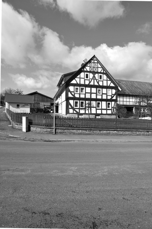 Der giebelständige Teil des zum großen Hof ausgebauten Anwesens besteht wesentlich aus dem Wohnhaus, das im Kern aus der Zeit um 1700 stammt. Es ist großenteils mit Platten verkleidet und verändert, erhalten blieb insbesondere die Giebelseite, die über dem verschindelten Erdgeschoss ein ebenmäßiges Fachwerkgefüge zeigt. Es ist mit Mann-Figuren ohne Halsriegel ausgesteift, hat eine über verzierten Konsolen vorkragende Brustriegelkette und als weitere Verzierungen Taustäbe an den Füllhölzern, Andreaskreuze unter den bogenförmig abschließenden Luken oberhalb des Kehlbalkens und eine Ausgestaltung des Eckständers mit gedrehtem Stab und Spiralen. Das Haus mit der zur Straße exponierten Sichtfassade ist Kulturdenkmal aus geschichtlichen, künstlerischen und städtebaulichen Gründen.