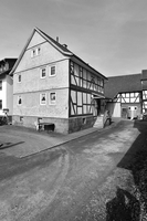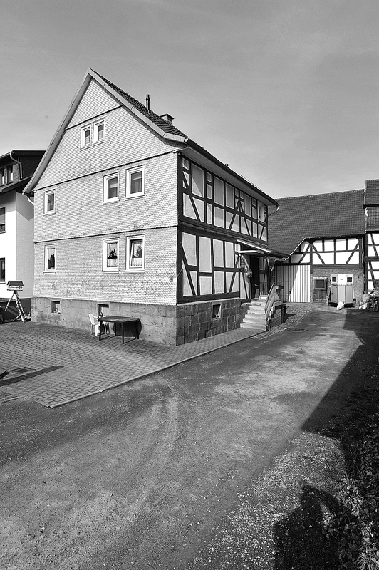 Die Hofanlage besteht aus einem Wohnhaus und einem separaten Stall- und Scheunentrakt dahinter. Das Wohnhaus ist ein zweigeschossiger, zweizoniger Bau über einem Kellersockel aus Sandsteinquadern. Kennzeichen des Gefüges, das an der zur Straße gerichteten Giebelseite mit Schindeln verkleidet ist, sind Mann-Verstrebungen ohne Kopfwinkelhölzer, noch eine angedeutete Geschossauskragung und die Datierung 1792 nebst Nennung des Bauherrn und seiner Frau in der Stockschwelle. Älter, nämlich nach Inschriften bereits 1747 errichtet, ist der Scheunen- und Stalltrakt dahinter, der teilweise erneuert ist, aber noch die wesentlichen Teile des ursprünglichen Fachwerkgefüges behalten hat. Im 19. Jahrhundert wurde ein einfaches Stallgebäude zwischen Wohnhaus und Wirtschaftstrakt errichtet.