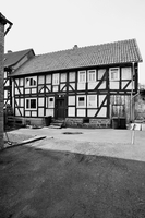 Von der Straße stark zurückgesetztes Fachwerkwohnhaus aus der Zeit um 1600. Kennzeichen der ursprünglich symmetrisch ausgeführten Fassade sind lange konkave Streben zu den Eckständern, kurze gebogene Fußstreben an den beiden Bundständern und ein reich ausgeführtes Quergebälk mit in Schiffskehlen eingelegten Tau- und Perlstäben. Das Haus ist wohl im späten 19. Jahrhundert im Erdgeschoss erneuert und nach beiden Seiten erweitert worden; im Obergeschoss blieb der rechte Eckständer mit schöner Schnitzerei (kräftiger Rundstab mit abschließenden Voluten) erhalten.