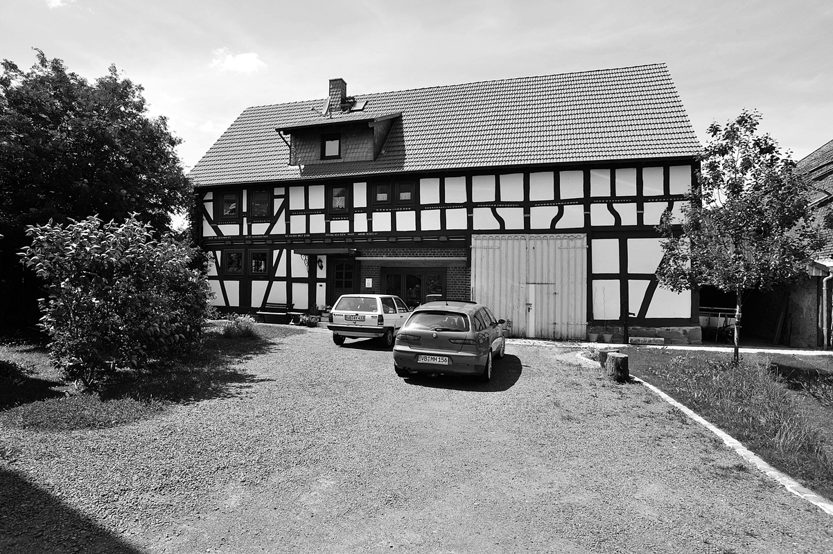Der von der Straße stark zurückgesetzte traufständige Hof ist zunächst wegen seiner besonderen Fachwerkausgestaltung von Bedeutung. Er wird in der Literatur außerdem als eines der ersten Beispiele eines Einhofs in der Region bezeichnet. Nach der Stockschwelleninschrift (Psalm 48 Vers 11: "GOTT WIE DEIN NAM IST SO IST AVCH DEIN RVM BIS AN DER WELT ENDE IOHAN HENRICH MVHT ANNO MDCCVI") ist das Anwesen 1706 erbaut worden. Es ist fünfzonig und bis auf den erneuerten Stuben- und den Stallbereich recht gut erhalten. Kennzeichen der so insbesondere mit dem auskragenden Obergeschoss in Erscheinung tretenden originalen Konstruktion sind das Quergebälk mit profilierten Balkenköpfen und Taustäben und die leichte Vorkragung der noch fast ganz durchlaufenden Kette der Brüstungsriegel, die ebenso wie die etwas tiefer ansetzenden konsolartigen Vorsprünge an Wandständern und Streben mit floralen Schnitzereien geziert sind. Bemerkenswert ist das Fehlen von alten Verstrebungen an der Ansichtsseite, nur der ebenfalls geschnitzte Eckständer der Oberstube scheint bereits ursprünglich durch eine halbe Mann-Figur ausgesteift gewesen zu sein. Auffällig sind auch die gebogenen Stiele, die symmetrisch angeordnet die Brüstungsgefache über Tenne und Bansen zieren.