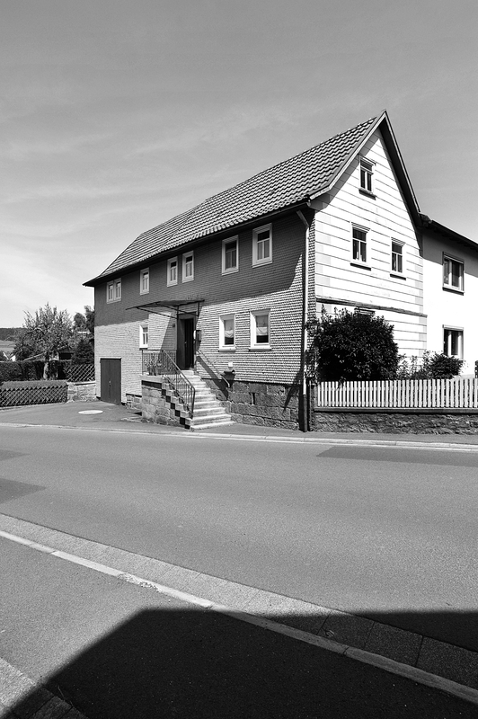 Kleiner Einhof, der wie das Datum am bemerkenswerterweise steinernen Türgewände zeigt, 1834 erbaut wurde. Er steht noch ganz in der älteren Tradition mit zweizonigem Wohnteil über einem Sockel aus Sandsteinquadern und anschließendem Scheunentrakt. Der Stall dürfte im hohen Sockel des Wohnhauses untergebracht gewesen sein. Die Vorderseite des Anwesens ist ganz verschindelt, das Gefüge als ein schlicht-konstruktives vorstellbar. Der Hof liegt wirksam in einer leichten Biegung der Straße, so dass der (freilich mit Platten verkleidete) Südgiebel ein wichtiges Element am Eingang zum Dorfkern darstellt. (g.s)