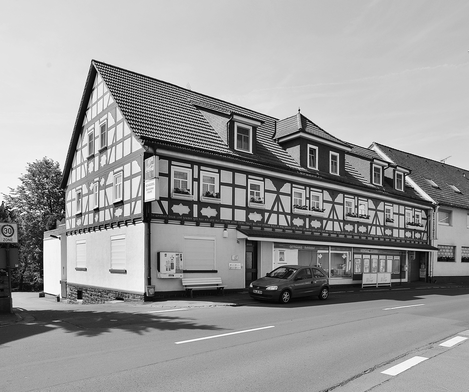 1935 gestreckt an der Hauptstraße platziertes Wohn- und Geschäftshaus; sein massives Erdgeschoss ist später für einen Supermarkt beträchtlich verändert worden, nur an der linken Seite blieb die ursprüngliche Situation nachvollziehbar. Wesentlich für die Gesamterscheinung ist jedoch das über profilierten Balkenköpfen ein wenig auskragende Obergeschoss in einem zeittypisch ausgebildeten Fachwerk, das mit zweifach verriegelten Mann-Figuren an ältere Bauten erinnert. Schmuckelemente sind geschweifte Kopfwinkelhölzer und sternförmige Felder unterhalb der Fenster. Auch die über die Giebel- und die gesamte Traufseite ausgedehnte Bauinschrift folgt historischen Vorbildern; sie nennt den Bauherrn Robert Lind, dessen Ladenausleger mit der Brezel der Bäckerei erhalten blieb. Weiter werden der Architekt V. Schäfer aus Ilbeshausen, der Zimmermeister J. Heineck aus Salz und der Maurermeister J. Lind aus Bermuthshain aufgeführt. Das Haus, von einem späten, eher städtischen Heimatstil geprägt, ist als architektur-geschichtliches Zeitdokument und be-stimmendes städtebauliches Element Kulturdenkmal.