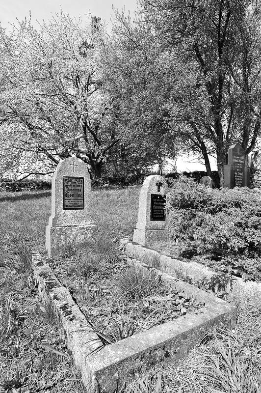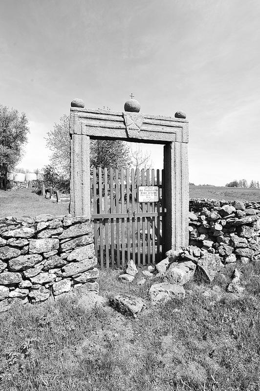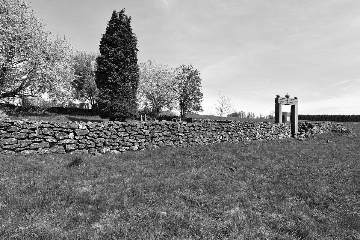 Beeindruckende Anlage im offenen Feld, vielleicht die frühere Ortslage bezeichnend und heute beinahe tausend Meter nordnordwestlich des Ortsrands und jenseits des Bachs gelegen. Das viereckige Gräberfeld ist mit einer niedrigen Trockenmauer umgeben. Nur in Richtung auf das Dorf wird sie geöffnet durch ein archaisch wirkendes rechteckiges Tor aus drei schlanken Sandsteinblöcken. Sie zeigen nach außen ein Profil aus zwei flachen Stäben und einen „Schlussstein" mit erhabenem Johanniterkreuz, unter dem eine Datierung 1766 lauten dürfte, während weitere Inschriften unleserlich geworden sind. Auf dem Torbalken sind drei Steinkugeln angeordnet, von denen die größere in der Mitte mit einem kleinen Eisenkreuz versehen ist. Der Friedhof wird seit 1966 nicht mehr belegt, nur einzelne Grabsteine aus der ersten Hälfte des 20. Jahrhunderts bis etwa 1960 sind als schöne Beispiele ihrer Zeit erhalten: in der Form meist kleiner Stelen, Lehnsockel oder Kissensteine aus Granit oder Kunststein, teilweise mit Inschriftplatten aus Glas. Friedhof, Mauer und Tor sind ein sowohl aus volkskundlichen wie auch aus orts-, sepulkralgeschichtlichen und künstlerischen Gründen zu erhaltendes Kulturdenkmal.
